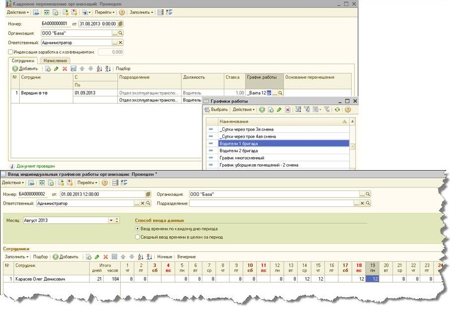 В зависимости от указанной в положении о заработной плате методики расчета нормы времени,можно при таком перемещении сформировать индивидуальный график Вложение 52409 Вложение 52410