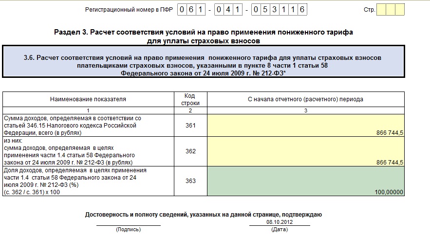 Поэтому, для того чтобы перейти на пониженный тариф нужно заполнить раздел 3.6 по форме РСВ-1 ПФР. В этом разделе я указал все поступления по тарифу содержание и ремонт за отчетный период нарастающим итогом.