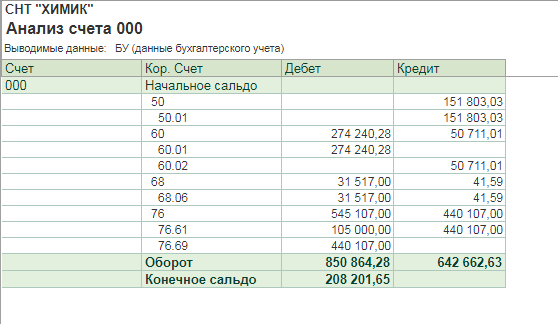 Общая ситуация такая - небольшое СНТ, из поступлений членские (и иногда вступительные) взносы и оплата садоводами электроэнергии по счетчикам, из списаний оплата электроэнергии по общему счетчики, оплата за аренду авто для разъездов председателю, налог на землю и всякие мелочи по авансовому отчету (канцтовары, распечатка и т.д.), ну и внесение денег из кассы на р/с.